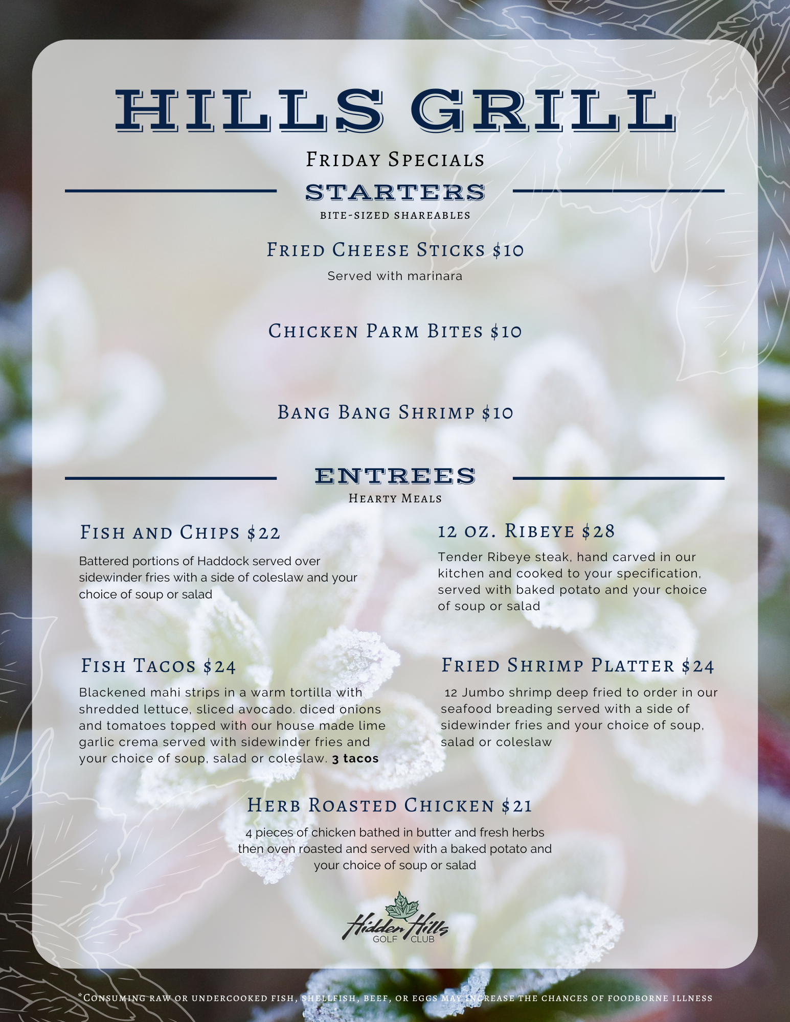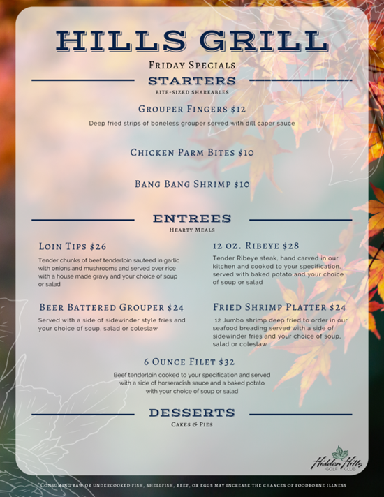 For your safety and convenience, we now offer curbside pickup. Simply call the Hills Grill at 904-641-8121 (ext. 123), place your order and we’ll meet you in front of the clubhouse where you can PICK UP & PAY from the convenience of your vehicle.